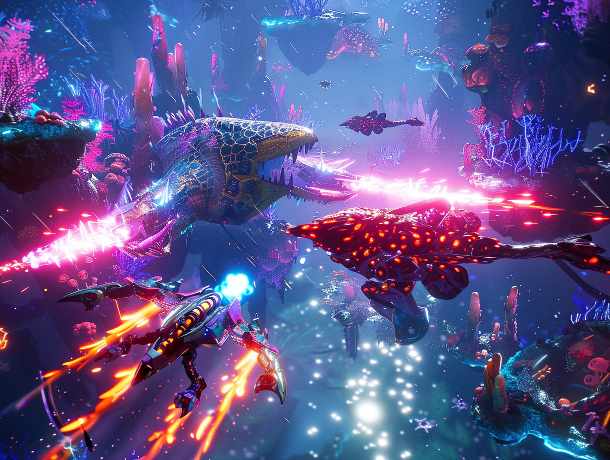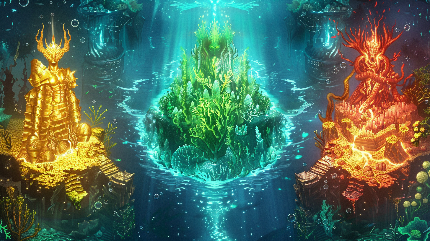Sea Wars unfolds across multi-kingdom realms of neon-lit crystal cities, volcanic structures, and coral temples. Each kingdom has unique culture, weapons, and a guardian sea god. The struggle for the Shared Relic will decide the fate of the deeps